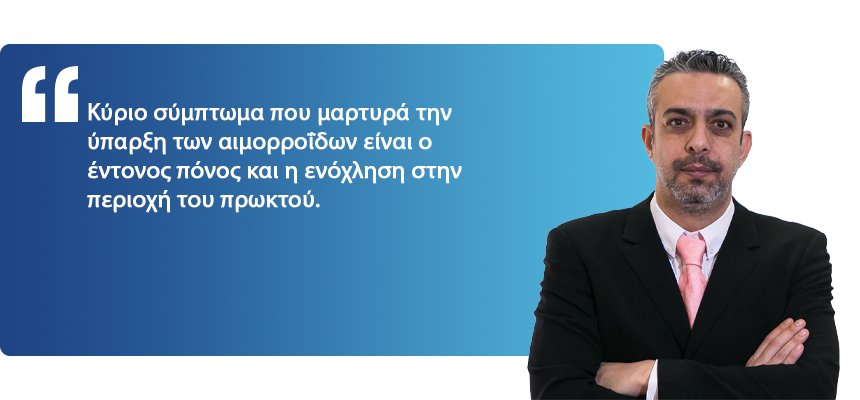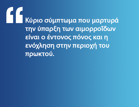 Κύριο σύμπτωμα που μαρτυρά την ύπαρξη των αιμορροΐδων είναι ο έντονος πόνος και η ενόχληση στην περιοχή του πρωκτού. Η καθημερινότητα του ασθενούς επηρεάζεται ιδιαίτερα από την πάθηση αυτή, καθώς η καθιστή στάση του σώματος είναι εκείνη που προκαλεί τον περισσότερο πόνο. Η αιμορροϊδοπάθεια είναι ένα σημαντικό πρόβλημα, το οποίο κάνει αισθητή την παρουσία του με έντονο τρόπο και χρήζει άμεσης αντιμετώπισης.